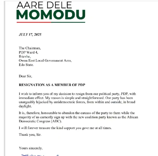 In a resignation letter dated July 17, 2025, addressed to the PDP Ward 4 Chairman in Ihievbe, Owan East Local Government Area of Edo State, Momodu said his decision to leave the party was effective immediately.