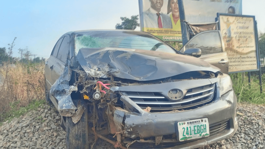 The accident, which occurred around 7:40 a.m. along the Obegu-Aba/Ogbaga Road, left the community in shock as residents woke up to the sight of the mangled motorcycle and a damaged metallic Corolla with registration number 241-EBGH.