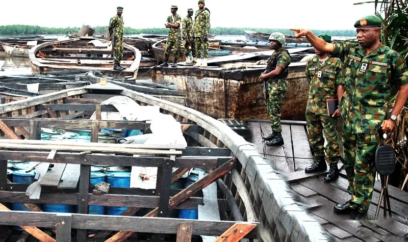 In Rivers State, military personnel conducting pipeline surveillance in the Cawthorne Channel I, II, and III areas of Degema Local Government Area intercepted a wooden boat carrying more than 5,000 liters of crude oil. A large wooden boat suspected to be used for illicit activities was also destroyed.